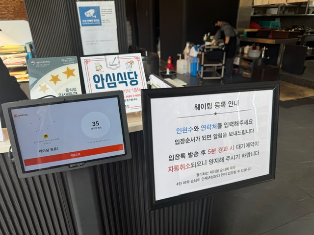 입구에는 태블릿 웨이팅 등록 시스템이 설치되어 있습니다. 이름과 인원수를 입력하면 대기 순서와 입장 알림을 문자로 받아볼 수 있어요. 자리를 비워도 5분 내 입장하지 않으면 자동 취소된다는 안내가 깔끔하게 적혀 있습니다. 대기 중엔 로비에서 직접 만든 반찬도 구매할 수 있습니다.