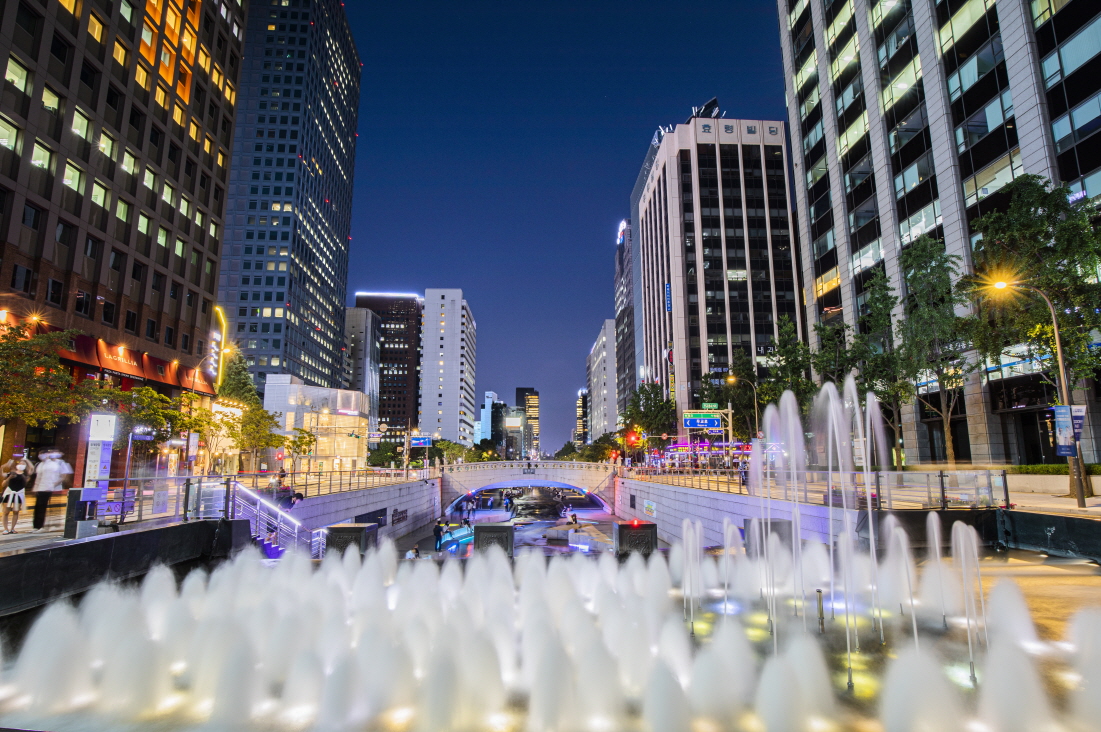 - 청계광장 입구: 대형 트리와 미디어 파사드가 설치되어 있습니다.