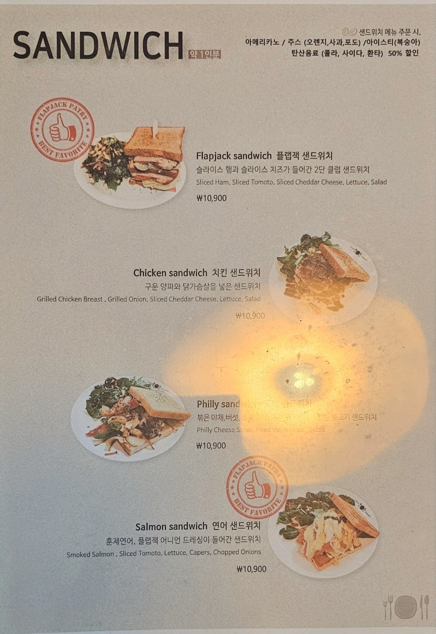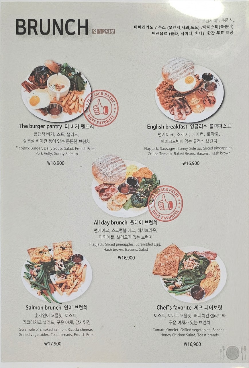 - 대표메뉴: 플랩잭 팬트리, 빠네 파스타, 오리지날 팬케이크, 플랩잭 버거
