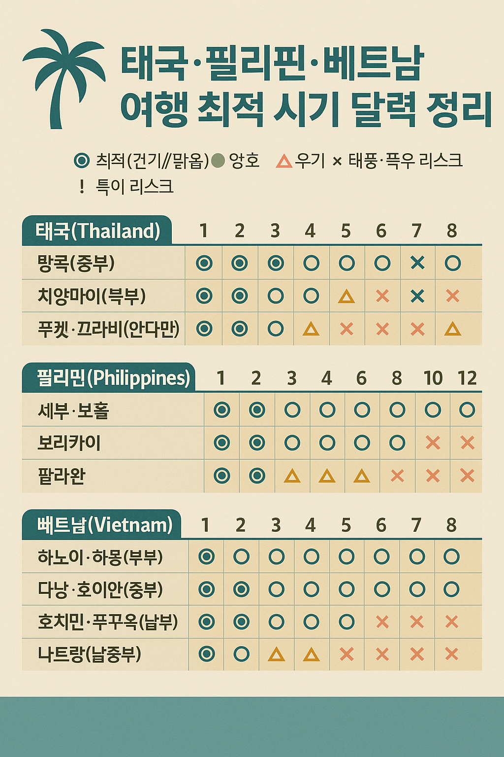 ◎ 최적(건기/맑음) · ○ 양호 · △ 우기 · × 태풍·폭우 리스크 · ! 특이 리스크