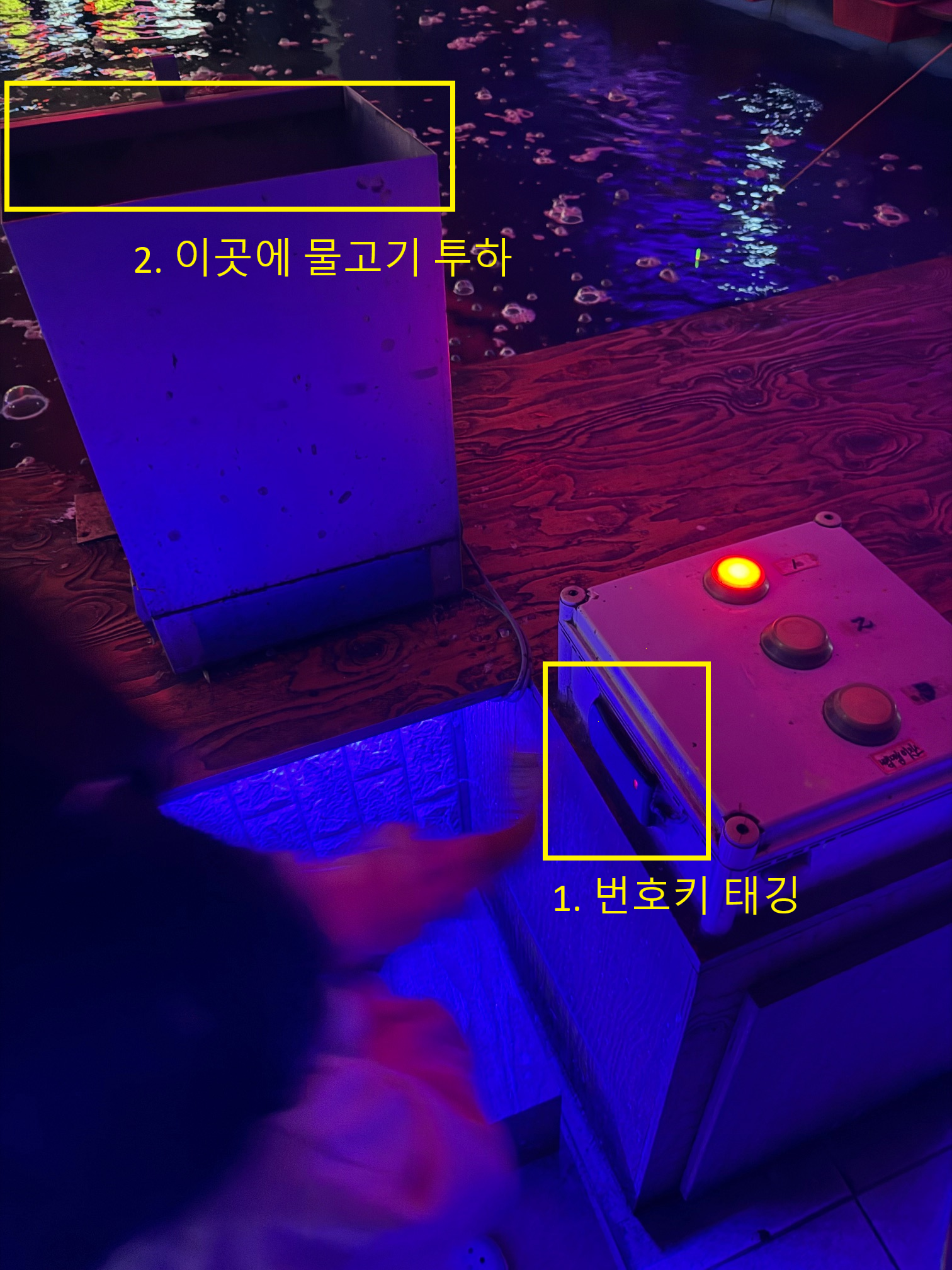 1. 번호키를 태깅 먼저 하고, 2. 공간에 물고기를 넣으면 됩니다. 뜰채를 거꾸로 뒤집어서 넣어주면 됩니다.
