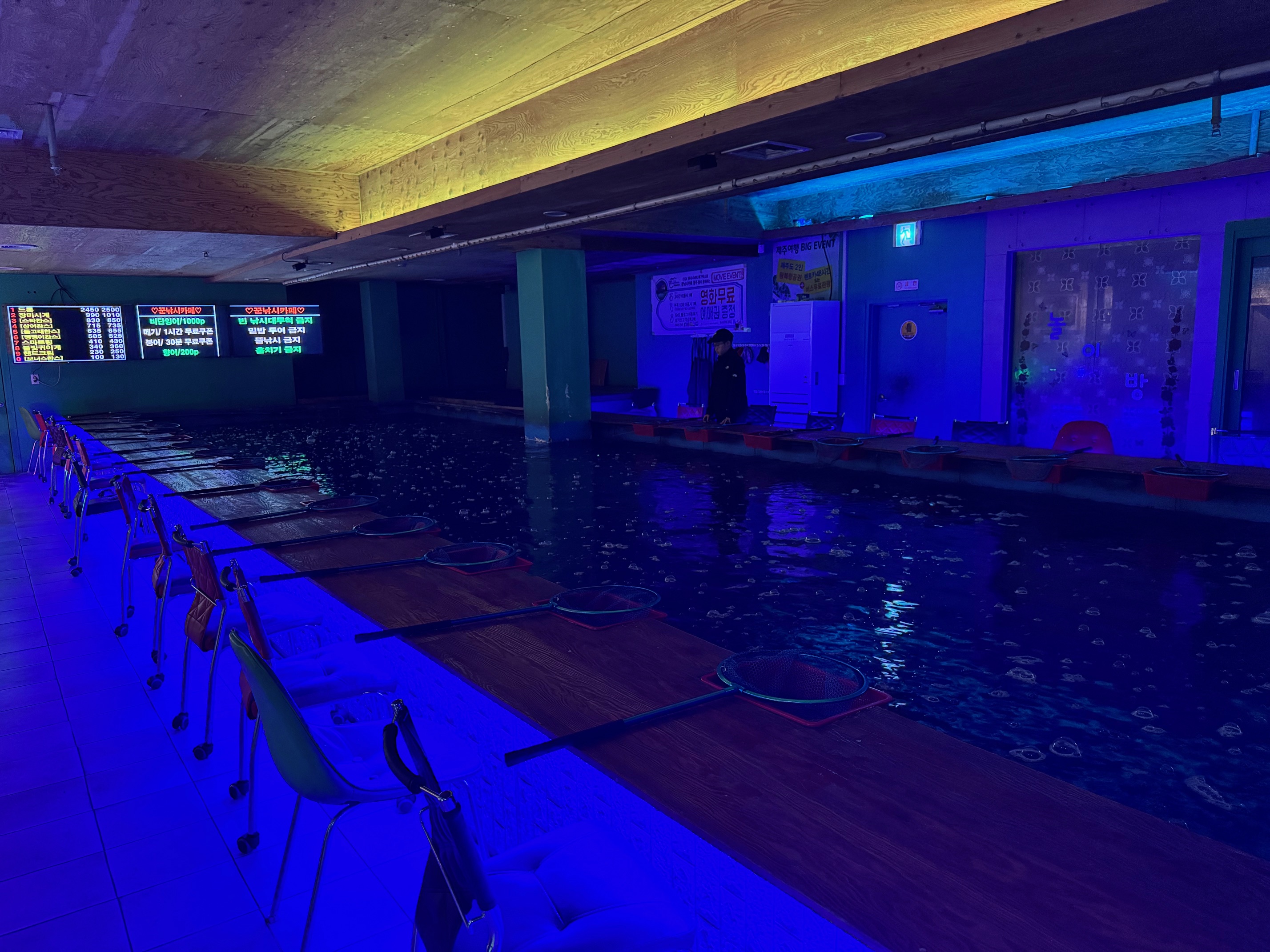실내는 깨끗하고 조용해서 초보자들도 부담 없이 즐길 수 있고, 의자와 낚싯대 간격도 넉넉해 옆 사람 신경 안 쓰고 낚시에 집중할 수 있어요.